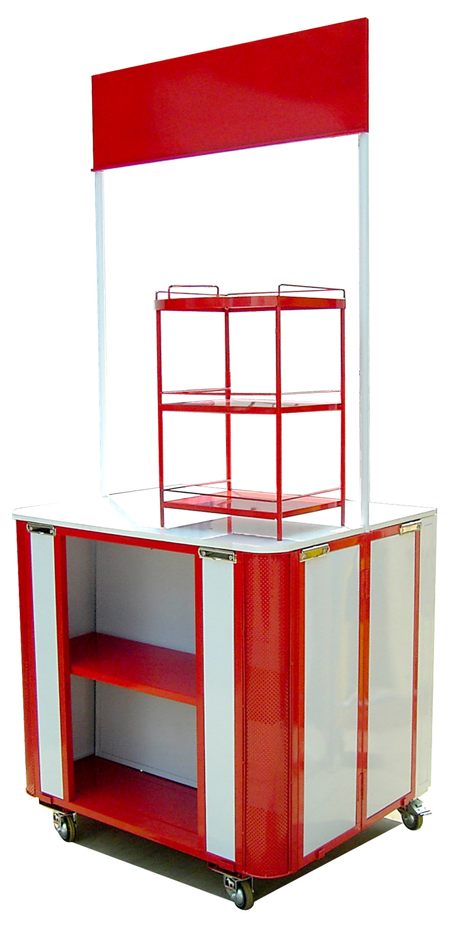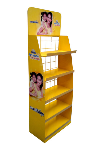 ชั้นโชว์สินค้า แบบวางบนพื้น เพื่อจำหน่าย หรือ ประชาสัมพันธ์ ขนาดกระทัดรัด น้ำหนักเบา เคลื่อนย้ายสะดวก ทำได้จากวัสดุหลายชนิด เหล็ก ฯลฯ
